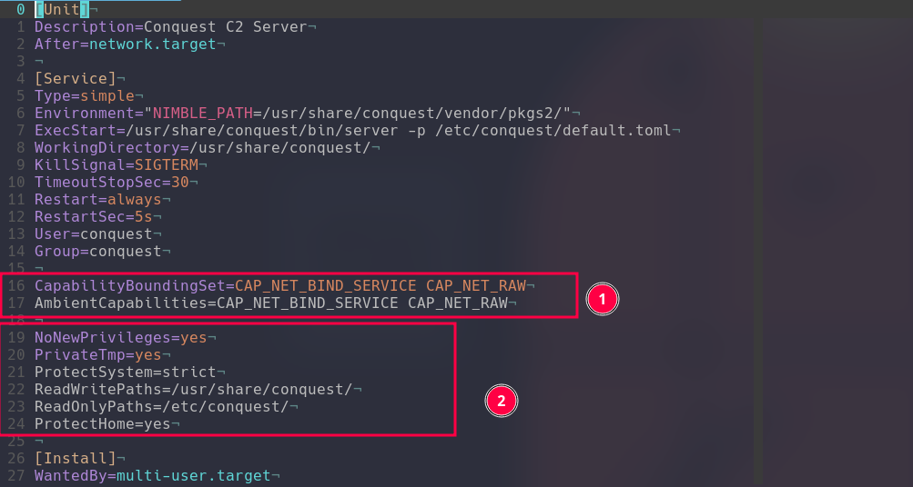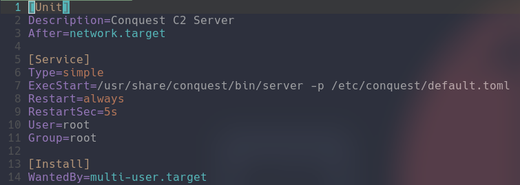 The syntax for a systemd service is actually quite simple you just need to point it to the binary of the server and tell systemd where it should be installed and what it's dependent on. Now since this project is a C2 originally we just decided to have it run as root since we want to listen on any port and we need read/write permissions on the folders in /usr/share/conquest to build the agents. Also since a C2 conquest relies on the network to be online which is why we require network.target. From this managing the service is quite simple: