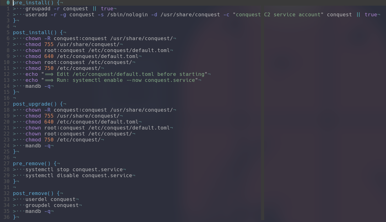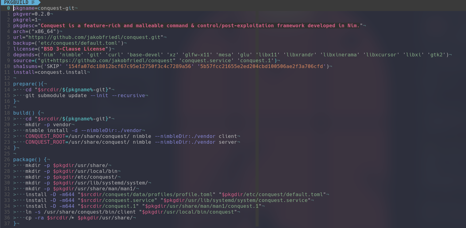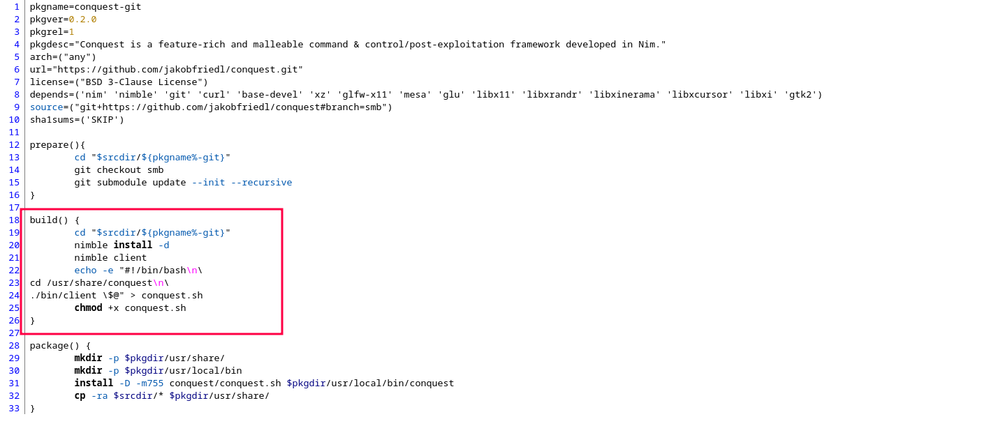 The -git packages are actually just the git repo cloned and built directly by your makepkg command. Usually they also install the source code of the project in /usr/share/. This is perfect for conquest since conquest is very having the source code ready dependant. First for changing around signatures on the fly having a copy of the source code to rebuild the package makes a lot more sense than having static binaries where you can't simply edit them. Also the C2 server builds agents for you so at a minimum it needs the source code of the agents. In our case going with a -git style AUR package made a lot of sense.