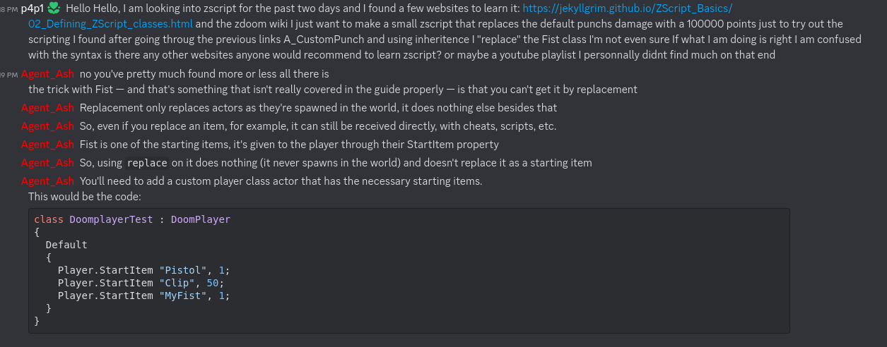 So inside of gzdoom there is a gzdoom.pk3 archive where a lot of the weapons are just defined from that I can at least understand how the default fists work. A pk3 file is basically a doom mod pk3's are just .zip file you just have to rename pk3 to zip and vice versa ^^. A lot of the source is also text files which allows for great reverse engineering capabilities since everything is just there for you to read. Now trying to replace the fist using the zscript builtin inheritance and replace keyword was not really working for me and I just got frustrated after doing it for two days so I went on the gzdoom discord... The fists where not loading in game I spammed console.printf everywhere to see what was wrong but nothing was loading why...