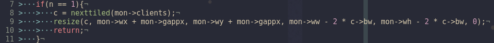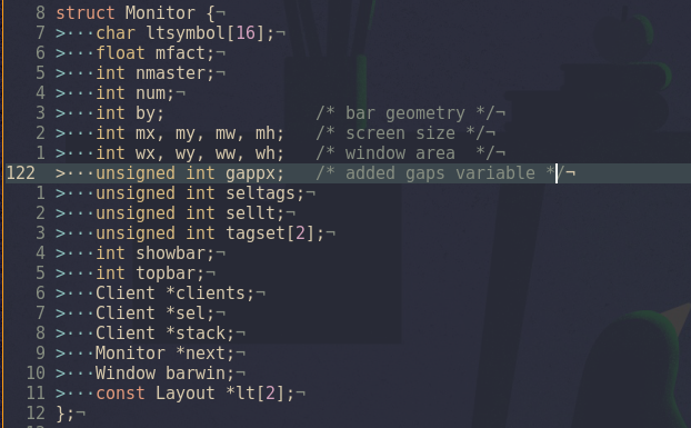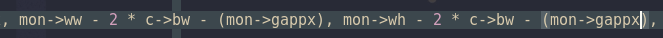 So I start simple I first implement the gaps on the top and left side of the window by adding those two " + mon gappx" and then recompile: