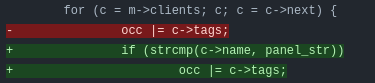 Basically this function is recursive so for every window it will either show or hide it from the currently selected tag (basically tags are desktops). So in red is the code I added where if the class name of the window is panel_str it will just never hide it!