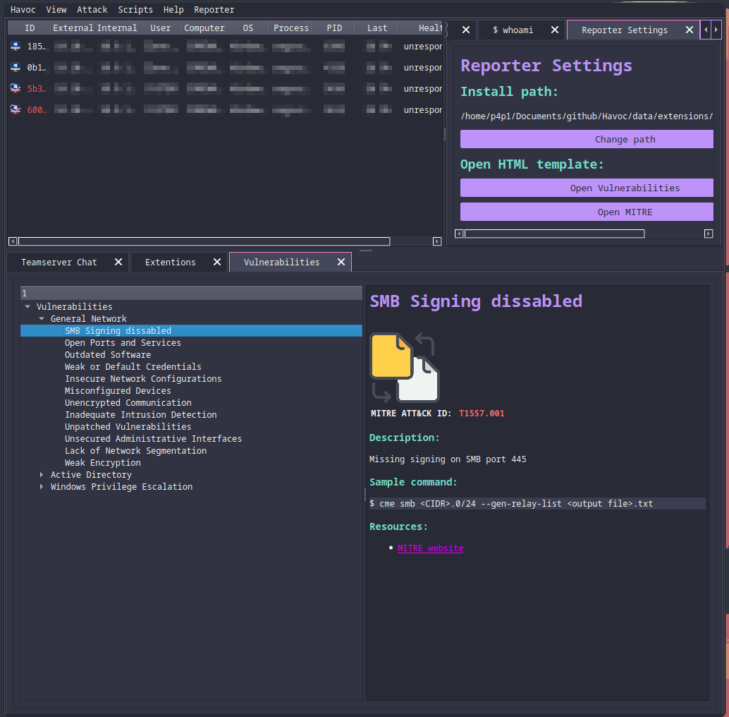 The first extension that I wanted to showcase was one of mine. Havoc reporter is an extension to assist you during a pentest / red team. It uses HTML and CSS to display vulnerabilities you can test when you need to figure out your next step or what to enumerate. This extension can also be extended on it's own thought the HTML and CSS to fit your own report template so that form Havoc you can copy paste vulnerabilities directly to your reports!