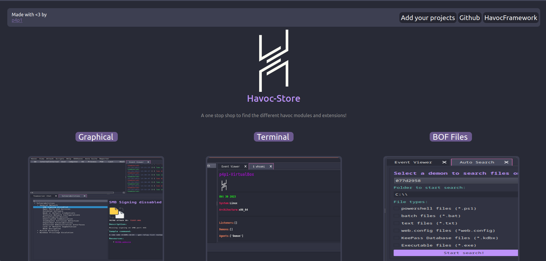 They are many more modules and I highly recommend you to visit: https://p4p1.github.io/havoc-store