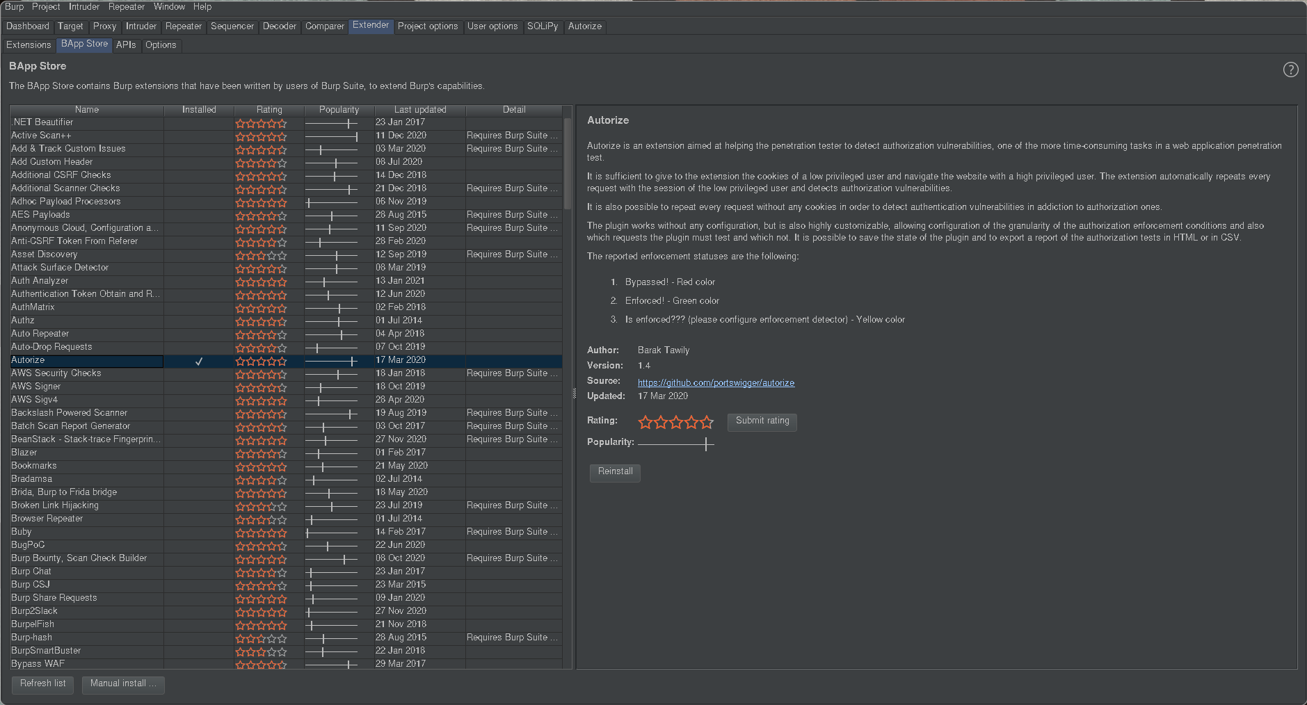 You then need to install the plugin itself to find IDORS. You can find them manually but this tutorial is focused on automation ;). To install the plugin navigate to Extender>Bapp Store and install the Authorize plugin.