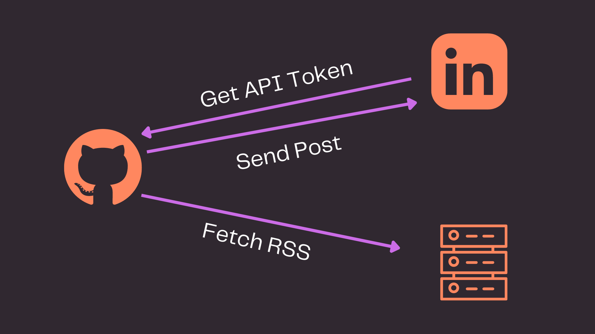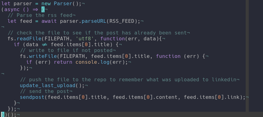 I basically fetch the RSS feed stored in the environment variable using parseURL I then check if in the file provided if the latest blog post title matches the saved one if not update the file on the github repo and send the post on the linkedin profile.
