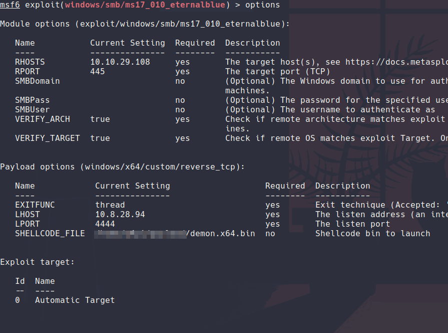 I am skipping most of this machine since I am expecting someone reading this to have an idea that ms17-010 is a buffer overflow vulnerability on SMB on older windows and is just a classic of a vulnerability. After setting up on msfconsole the ms017-010 exploit exploit/windows/smb/ms17_010_eternalblue we can set the payload to windows/custom/reverse_tcp and put options like inside of msfvenom