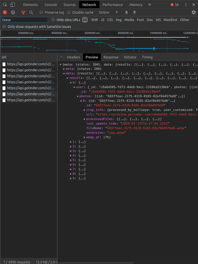 Seeing this blur effect and the image all pixelated I was wondering how the website recovered images from the server so I went through and opened the network inspector and started seeing requests to "api.gotinder.com"