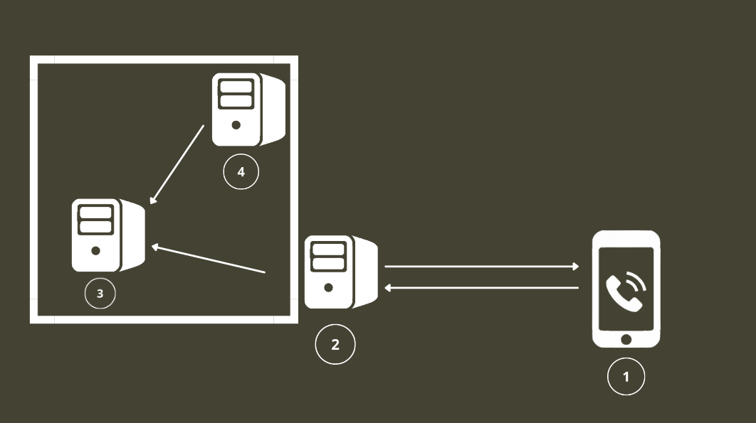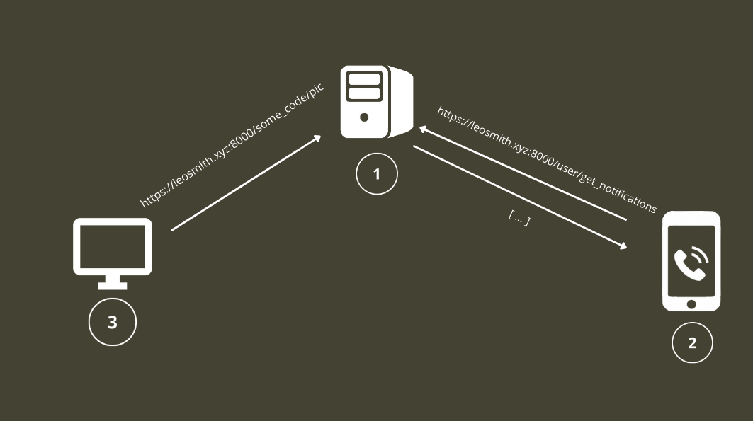 Inside of the current architecture the phone client (1) connects to the server (2) which is connected himself to the MongoDB database (3). There also is a Mongo Express (4) instance running on localhost inside of the server so that the administrator can manage the database and stuff. As shown by the square around the MongoDB database (3) and the Mongo Express instance (4) they both listen on localhost so they are not accessible by the public and should never be opened to the public ;) I achieved this by setting listening ports like this inside of the docker-compose.yml file.