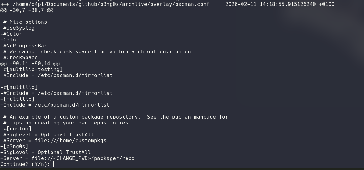 The build script will first take the upstream version of archiso in /usr/share/archiso/configs/releng/ and will diff it for you the p3ng0s edits this is done so that if upstream has a lot of changes we can catch them quickly and patch the iso accordingly. For those prompts you can simply press enter after reviewing them if it seems good for you.