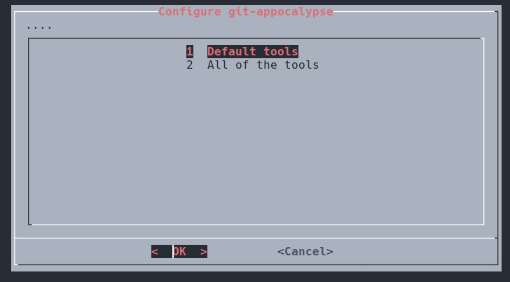 From there you will finally get prompted by the packager repo that just got cloned in the current working directory to specify what toolset you want. I recommend going with Default. If you specified a custom git-appocalypse tool list use Default.