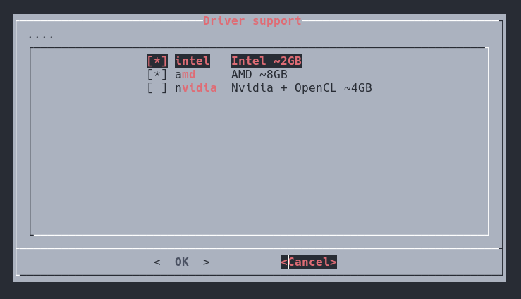 The next step is GPU support. Here i personally recommend picking the "least" amount of support to not have a giant .iso that takes hours to build. By default Intel and AMD are selected since those are the most broad in my household but please for your own sake pick the least amount of GPU support. This will only be used by hashcat in cracking mode later so going Intel only could be more viable for you.
