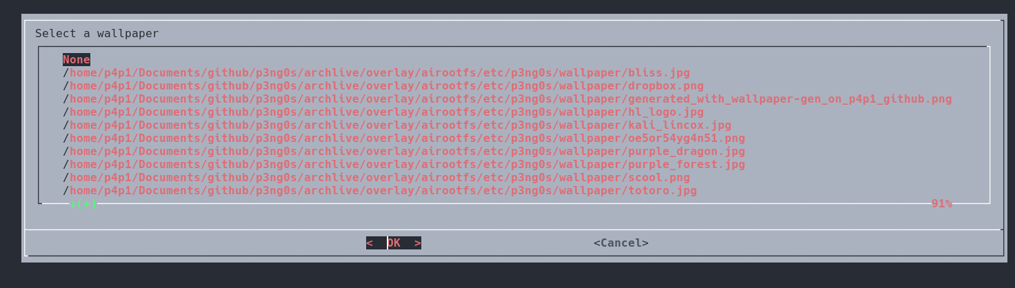 After that you will be prompted to pick a wallpaper. Now the current wallpaper collection is my personal one that i just dumped from my system. You can if you want add your wallpapers to ./overlay/airootfs/etc/p3ng0s/wallpaper/ and select it from the dialog prompt. The default wallpaper is named default.png.