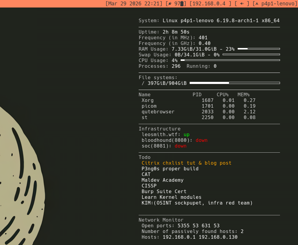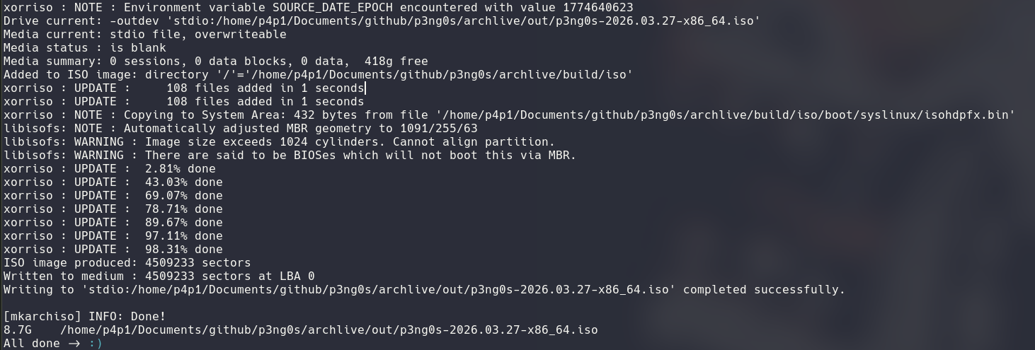 p3ng0s.iso is a security focused live operating system I build and maintain that collects all of my configuration since 2014 and common attack chains I do during engagements. This live operating system is geared towards red teaming and physical access. Most of the custom boot modes of the .iso rely on having access to the target system physically. It is not a beginner friendly linux distribution and I don't recommend building/installing it and using it as a daily driver. I personally do but every design decision in the daily driver/GUI department of the OS is built for me. Which is why there is no common "Create a user", "Choose timezone", "Choose keyboard" options. Currently p3ng0s.iso is US keyboard layout only and the timezone is not even set since those things aren't my priority yet. I might in the future add them but don't expect it to come with it as of now (April 2026).