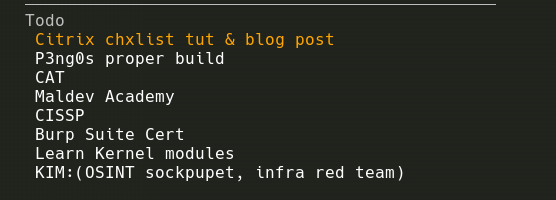 The second main feature is the todo list. This is managed by a .todo file in your users $HOME directory. The file should be formatted like so: