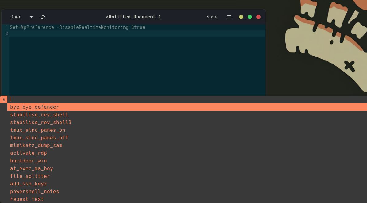 If you are familiar with the USB Rubber Ducky this feature is exactly that. There are a few common commands that are long that I forget all of the time that I compiled in this script and they will get auto typed to the selected window. Great for SSH or RDP sessions where all the custom shortcuts don't work.