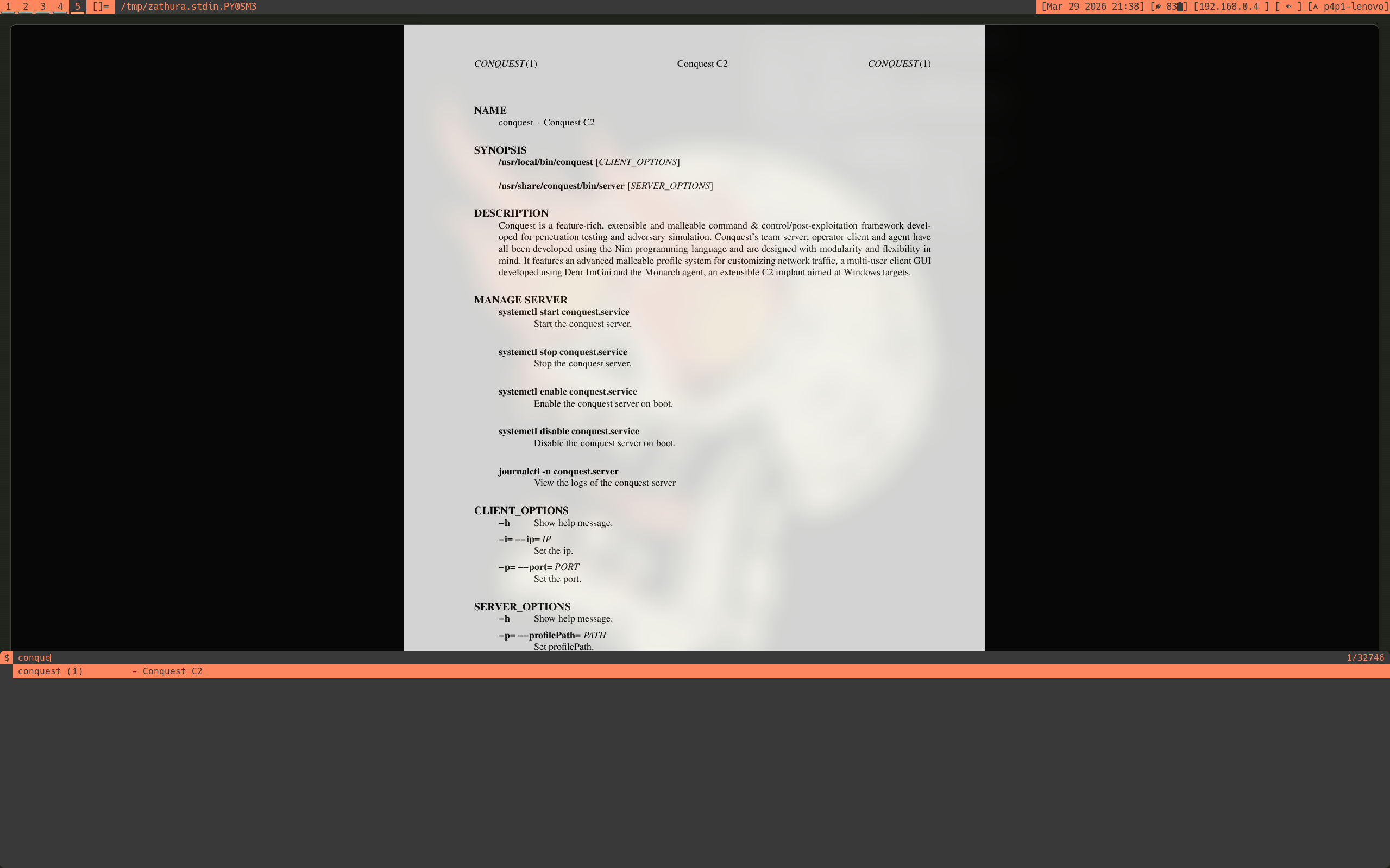 In this menu in the future you will also find extra documentation about the iso under the p3ng0s-*.pdf. There is also engagement specific documentation that can be gnerated and saved to a pdf file with the :print command inside of zathura. The interesting ones are p3ng0s-target This will create a pdf of every tmux session and their specific Variables set inside of them. There is also p3ng0s-network this will give you all of the network information of the machine.