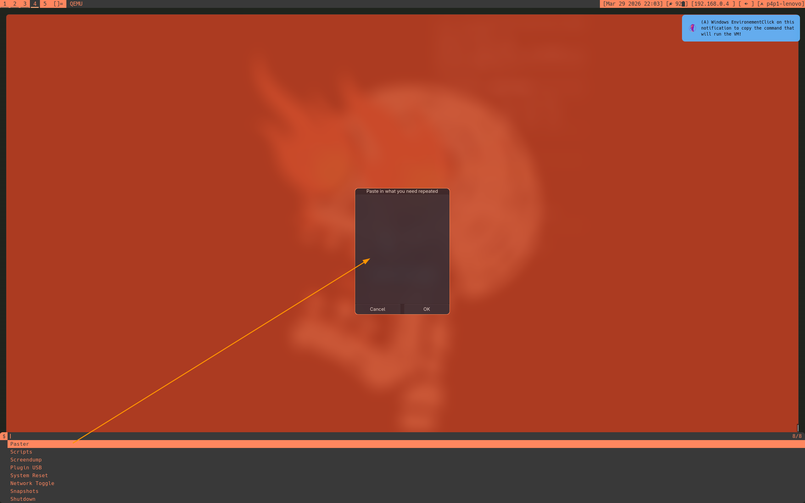 The manage VM feature is quite powerful as well. Same as the dmenu_keyboard there is an auto type section so that you can type into the VM by pasting text into a little box: