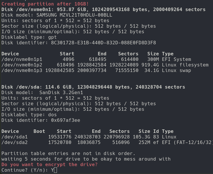 After that you will have to wait for the .iso to flash itself then the script will create a partition right after the .iso data for the LOOT partition. You have two options either go the encrypted route or the unencrypted route. Now if you select encrypted you will need to type at every boot of the .iso the password to decrypt the partition. Since we are not crazy we won't store that password in clear text in the .iso. I personally do recommend encrypting the partition since that is where all your operational data will be located (Attack VPS info, cracking data, extracted creds, etc...)