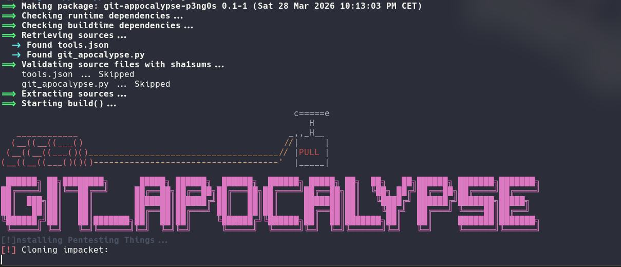 This project has to be built I am not providing an .iso since most of the OS configuration is done at build time: live user password, wallpaper, if the loot partition is online or not (see loot section for more information about how the LOOT partition works). The build script also allows you to drop in any relevant extra operator data if you have multiple people on an engagement and also manage the pre-installed packages since hashcat mode will require specific drivers for your hardware and can make the .iso quite big. Same for the pentest tools you pick what tools you want before building by providing a .json or you can use the default ones (see git-appocalypse)