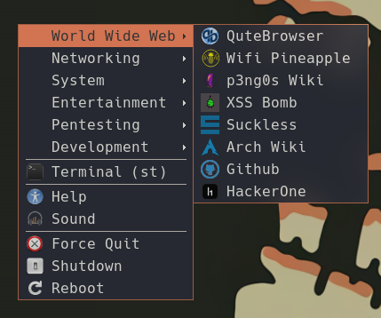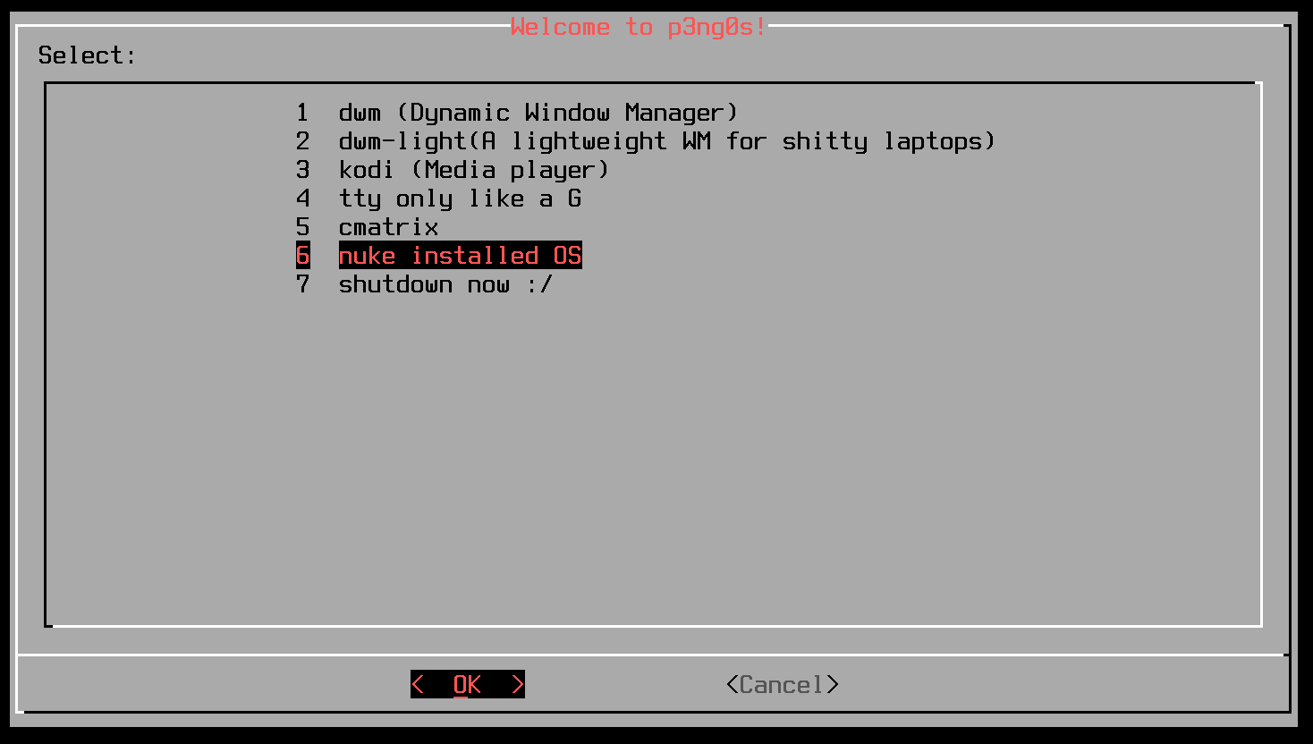 p3ng0s.iso uses dmenu for more information on dmenu see here. My fork of dmenu is based on dmenu version 4.9 its is quite well patched for a few things like click support centered menu and whatnot. I usually use dmenu to run apps and for a few core system functions that I automated through dmenu.