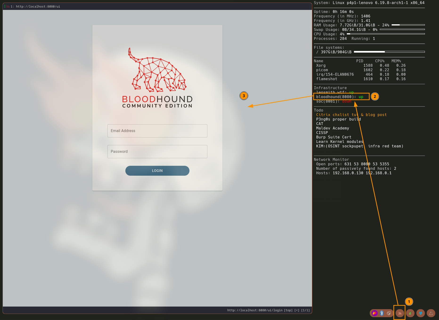 On the wallpaper of the .iso there is a live display of system usage through conky. This is great to see how long the system has been running the currently available RAM and CPU usage info. Inside of the conky config there also is a few neat features to keep it pentest focused.