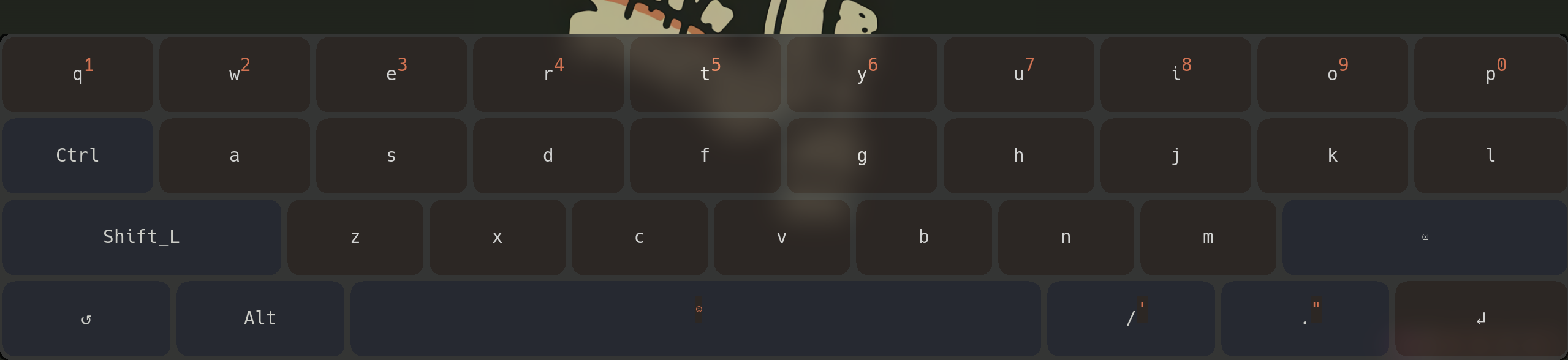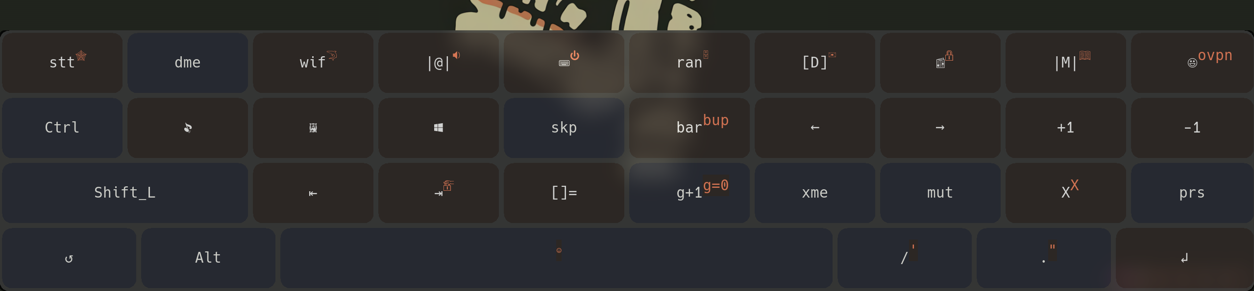 You can hold a button to get extra stuff like accents on letters, number in the first panel etc... On this keyboard there are 3 available layouts. First is letters, second is numbers and special characters, Third is a shortcut menu where you can do the DWM shortcuts with just one press of a button:
