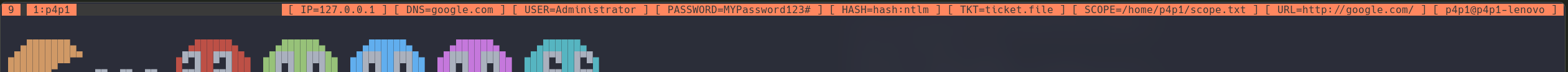 These variables are synced between each tab in the tmux session so you could have one tmux session per machine you are targeting. Here are the variables in bash: $IP, $USERNAME, $PASSWORD, $HASH, $KRB5CCNAME, $DNS, $URL, $SCOPE.