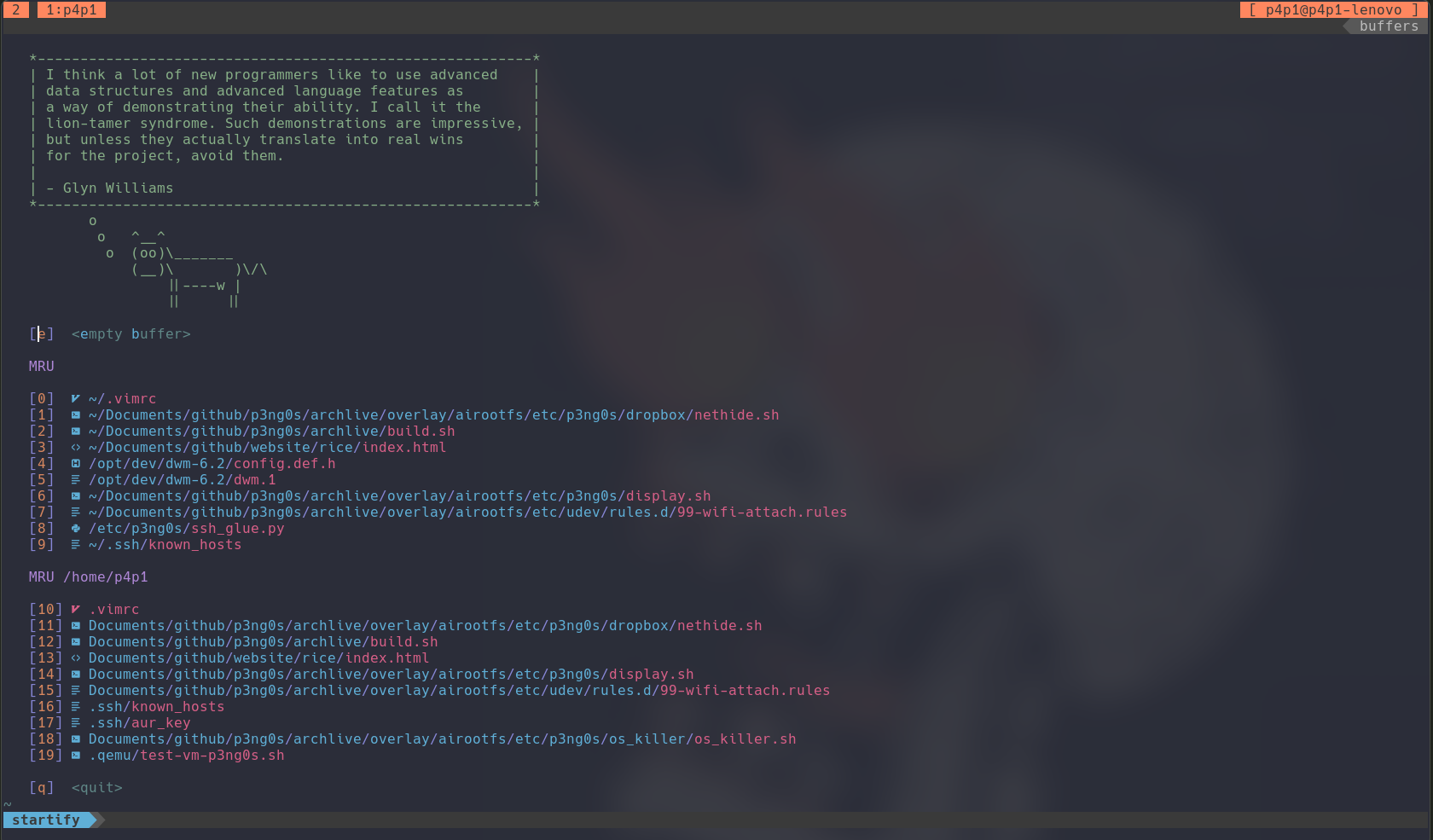 Compared to most popular kid I don't use neovim, I prefer just regular vim no other reason than this is the one I started with and spent the most time configuring. You can get a better picture of my vim config by reading the vimrc file in overlay/airootfs/etc/skel/.vimrc. But here are a few cool features.